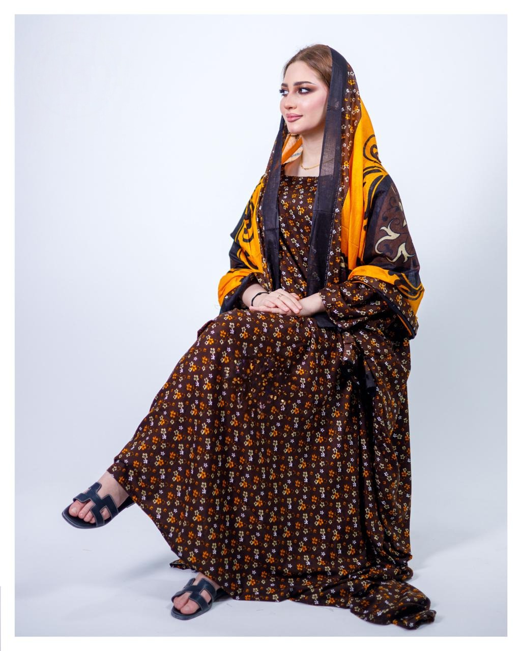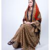 ثوب بني اللون مصنوع من القطن بتصميم جميل مطبوع عليه شيلة متناسقة مخيطة على الطراز الظفاري