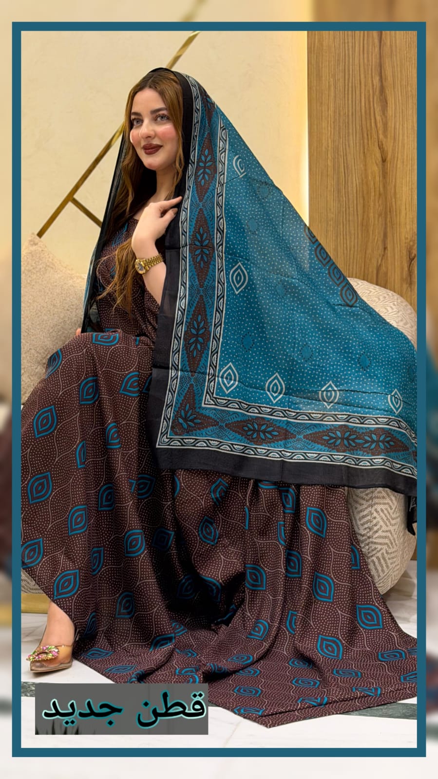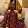 ثوب بني اللون مصنوع من القطن بتصميم جميل مطبوع، مزود بشيلة مطابقة مخيط على الطراز الظفاري