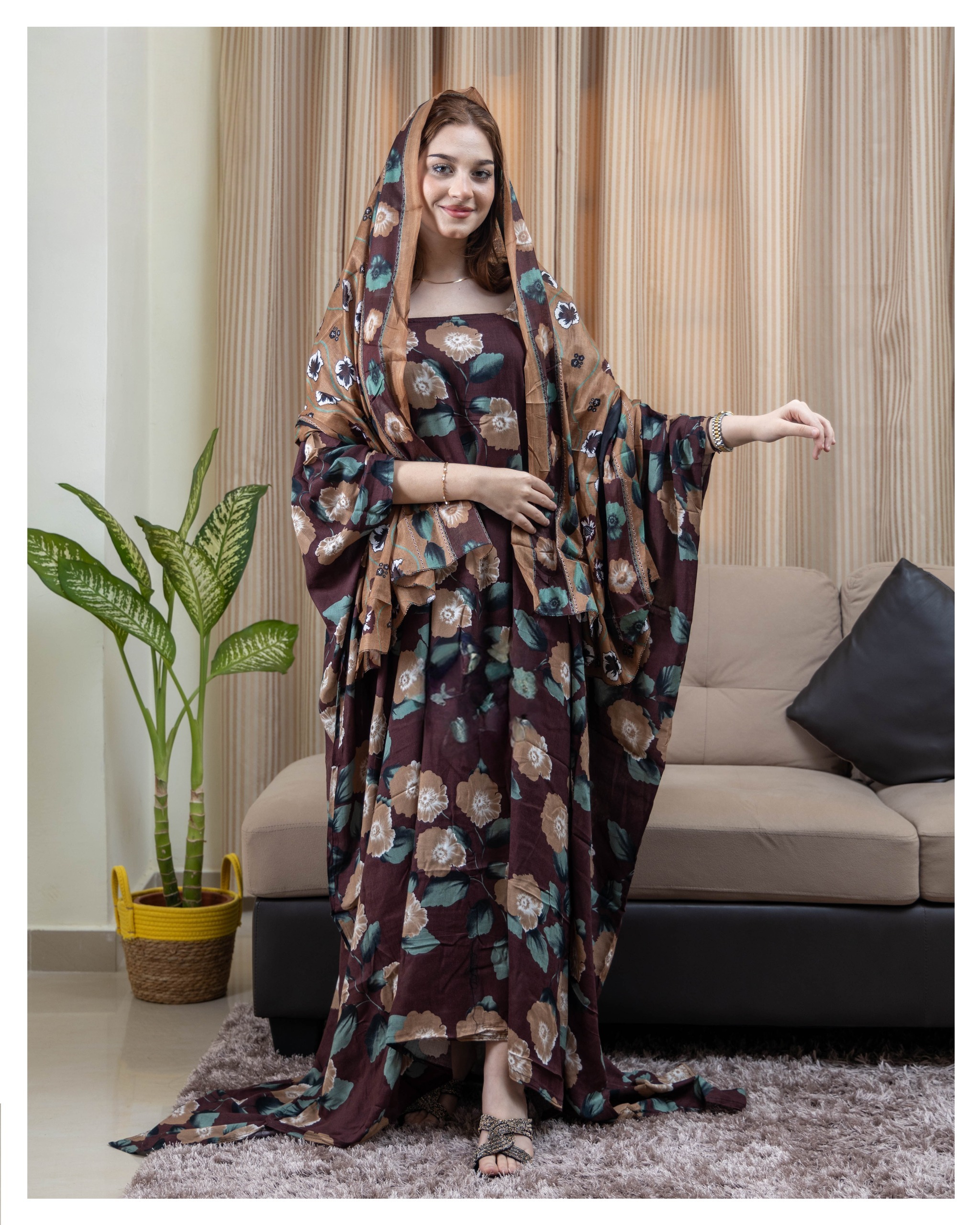 ثوب بني اللون مصنوع من القطن بتصميم زهور جميلة مطبوع عليه شيلة متناسقة مخيطة على الطراز الظفاري، متوفر مخيط وغير مخيط