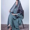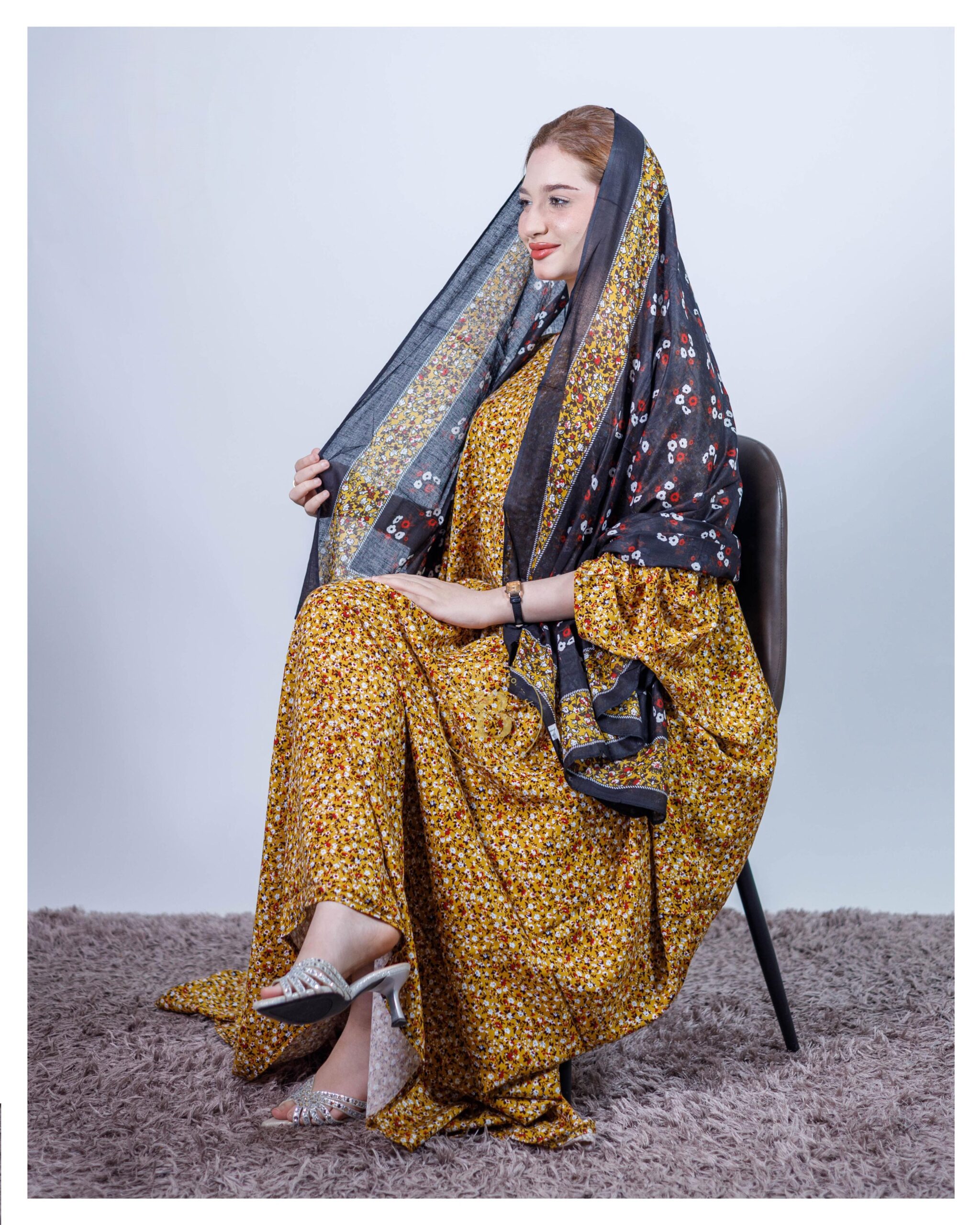 ثوب بني فاتح اللون مصنوع من القطن بتصميم زهور جميلة مطبوع عليه شيلة متناسقة مخيطة على الطراز الظفار