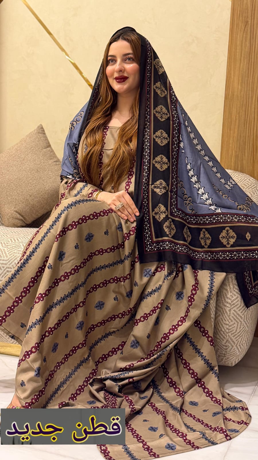 ثوب بيج مصنوع من القطن بتصميم جميل مطبوع، مزود بشيلة مطابقة مخيط على الطراز الظفاري