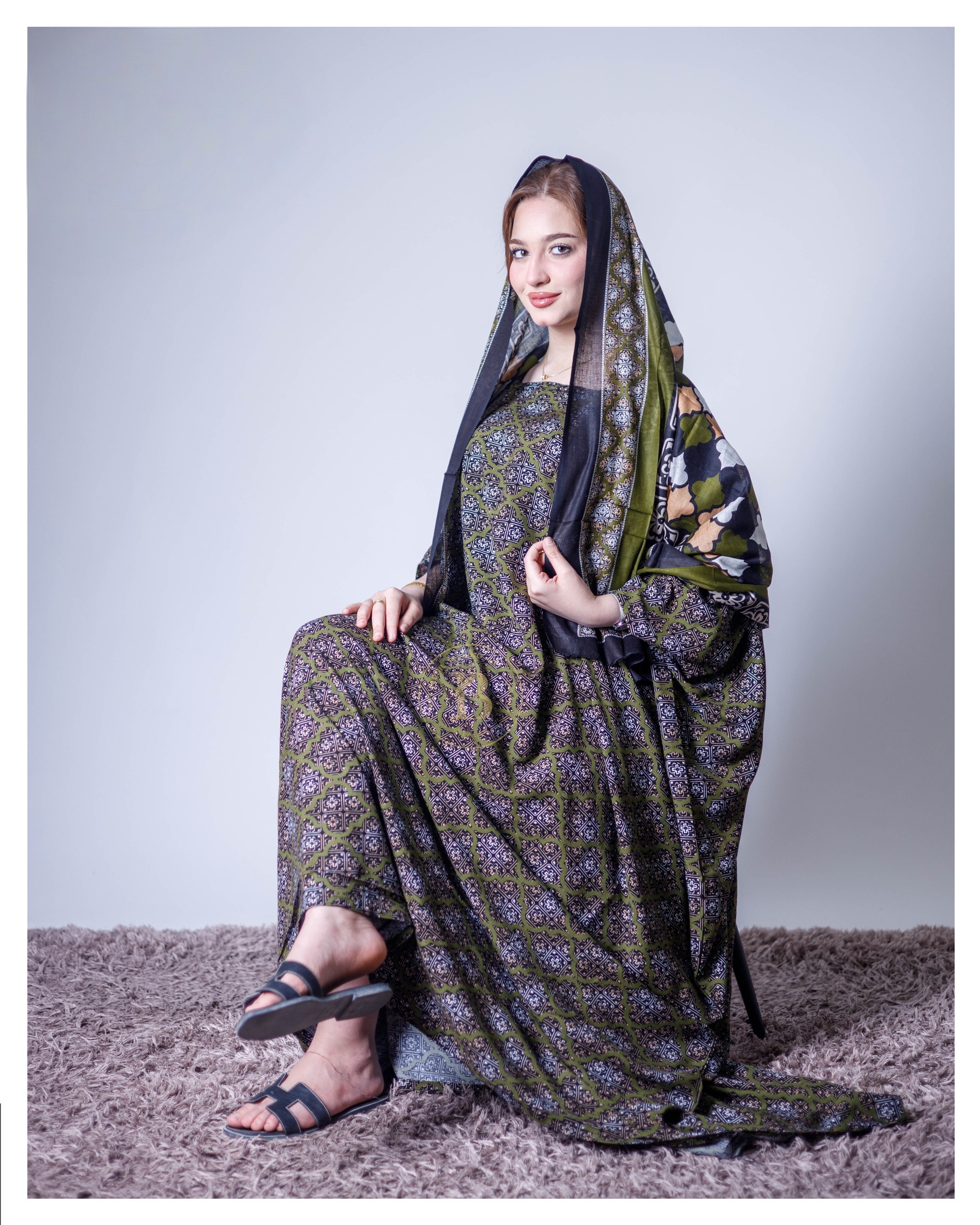 ثوب جميل اللون مصنوع من القطن، مزين بتصميم جميل مطبوع عليه شيلة متناسقة، ومخيط على الطراز الظفاري