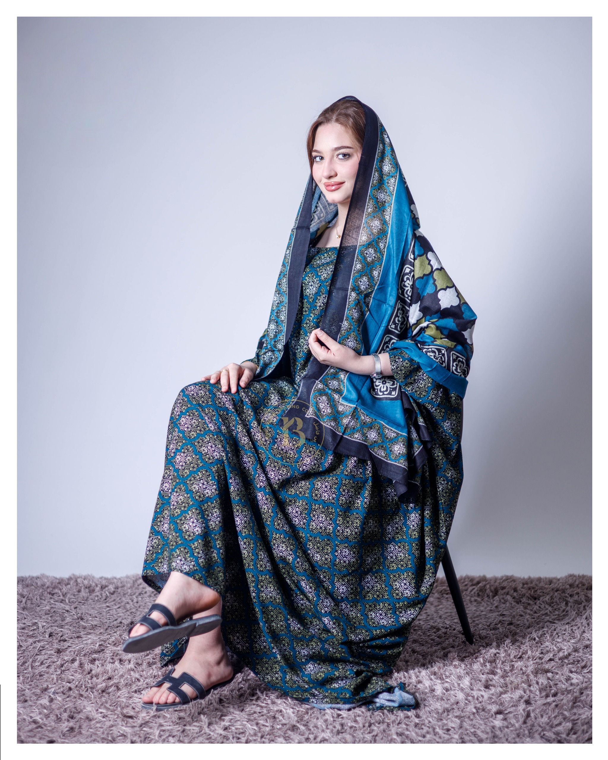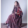 ثوب جميل اللون مصنوع من القطن، مزين بتصميم جميل مطبوع عليه شيلة متناسقة، ومخيط على الطراز الظفاري