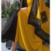 ثوب قطني بلون أصفر وعنابي، مزين بتصميم جميل مطبوع عليه شيلة متناسقة، ومخيط على الطراز الظفاري
