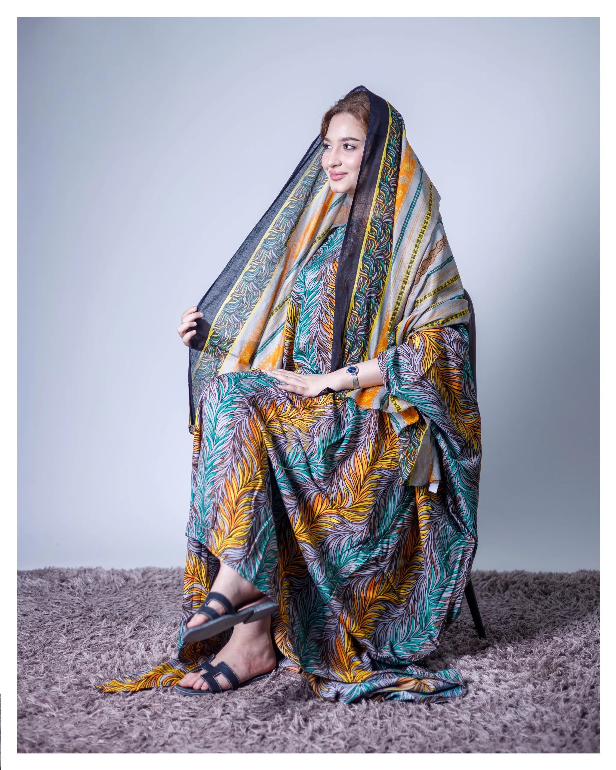 ثوب متعدد الألوان مصنوع من القطن بتصميم جميل مطبوع بشيلة متناسقة ومخيطة على الطراز الظفاري