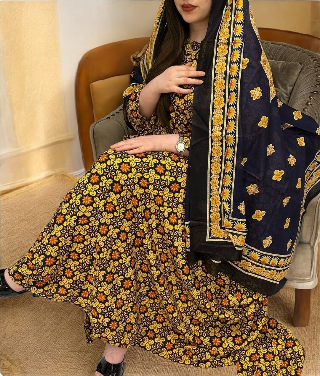 ثوب متعدد الألوان مصنوع من القطن بتصميم جميل مطبوع عليه شيلة متناسقة مخيطة على الطراز الظفاري