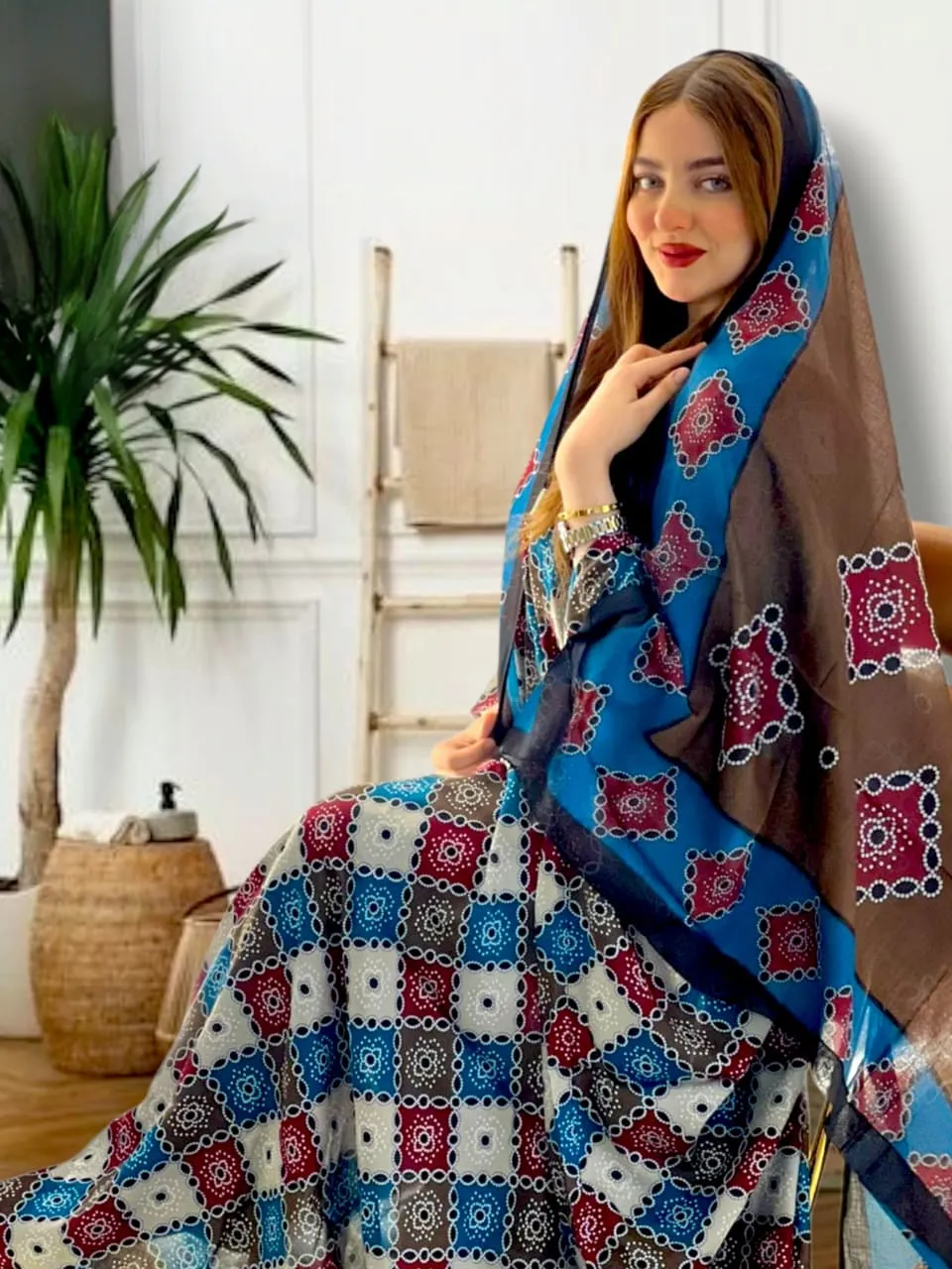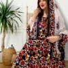 ثوب متعدد الألوان مصنوع من القطن مع تصميم زهور جميل مطبوع مع شيله مطابقة مخيطة على طراز الظفاري