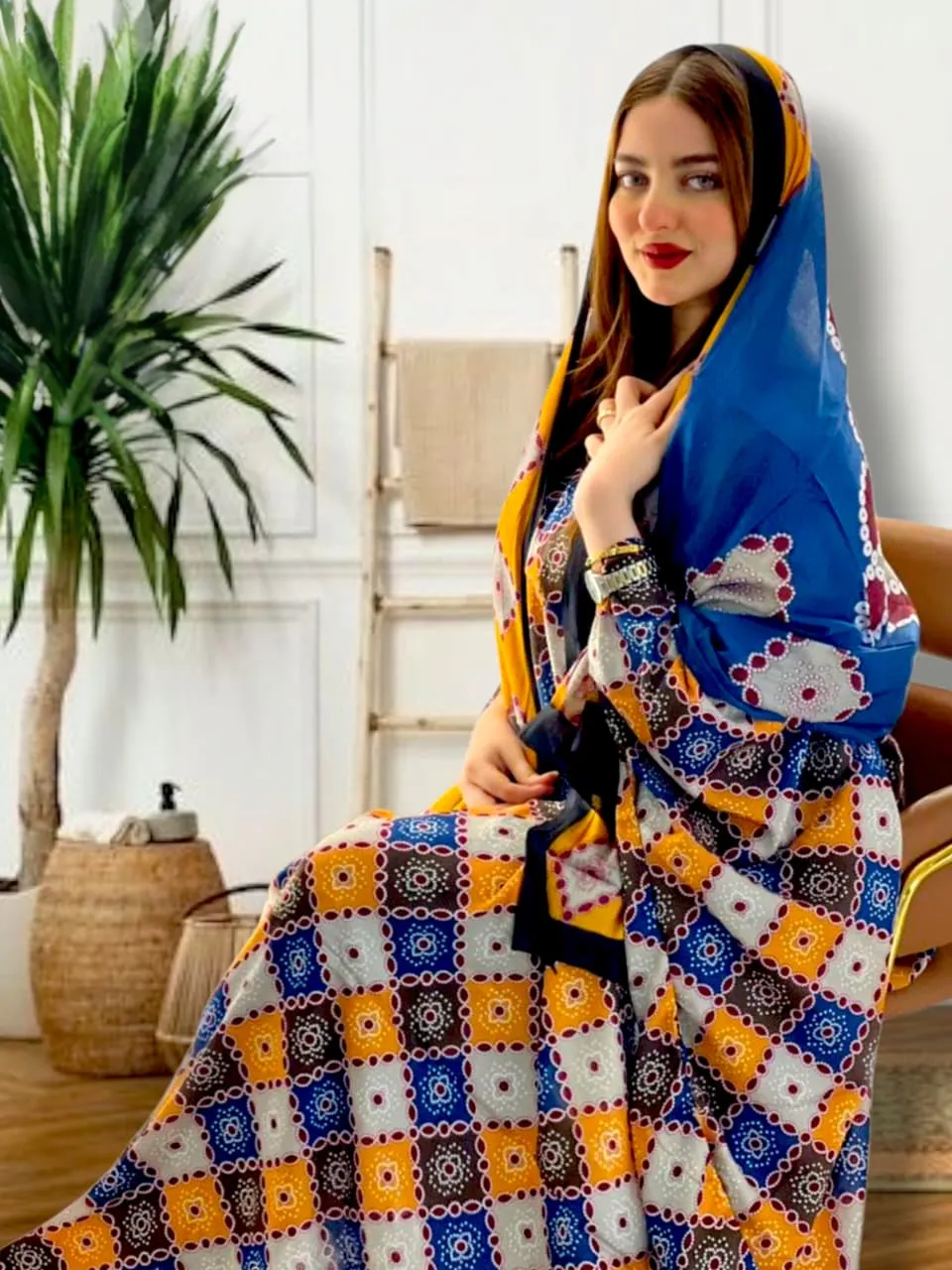 ثوب متعدد الألوان مصنوع من القطن مع تصميم زهور جميل مطبوع مع شيله مطابقة مخيطة على طراز الظفاري