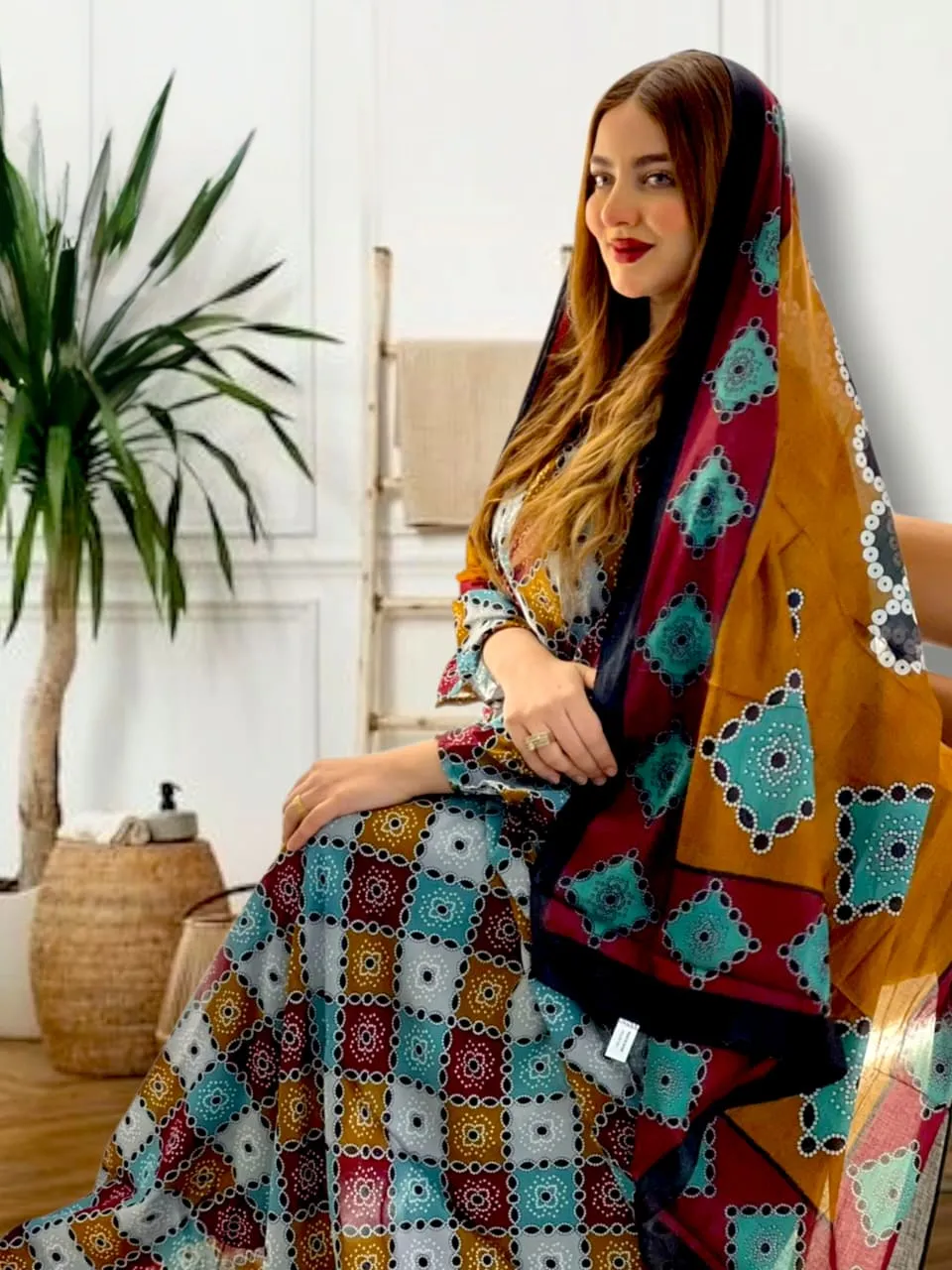 ثوب متعدد الألوان مصنوع من القطن مع تصميم زهور جميل مطبوع مع شيله مطابقة مخيطة على طراز الظفاري