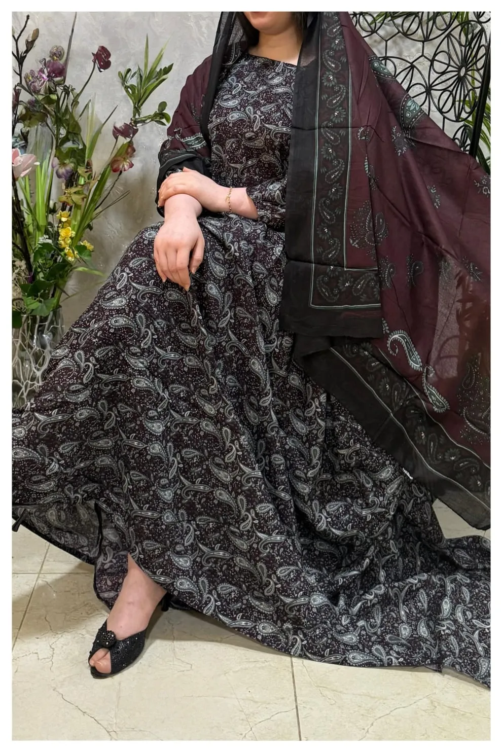 ثوب من القطن باللون التوتي والرمادي بتصميم جميل مطبوع بشيلة متناسقة ومخيطة على الطراز الظفاري