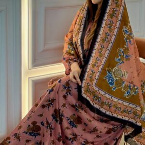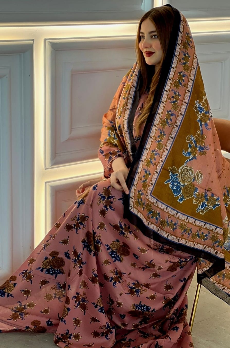 ثوب وردي اللون مصنوع من القطن بتصميم جميل مطبوع بشيلة متناسقة ومخيطة على الطراز الظفاري