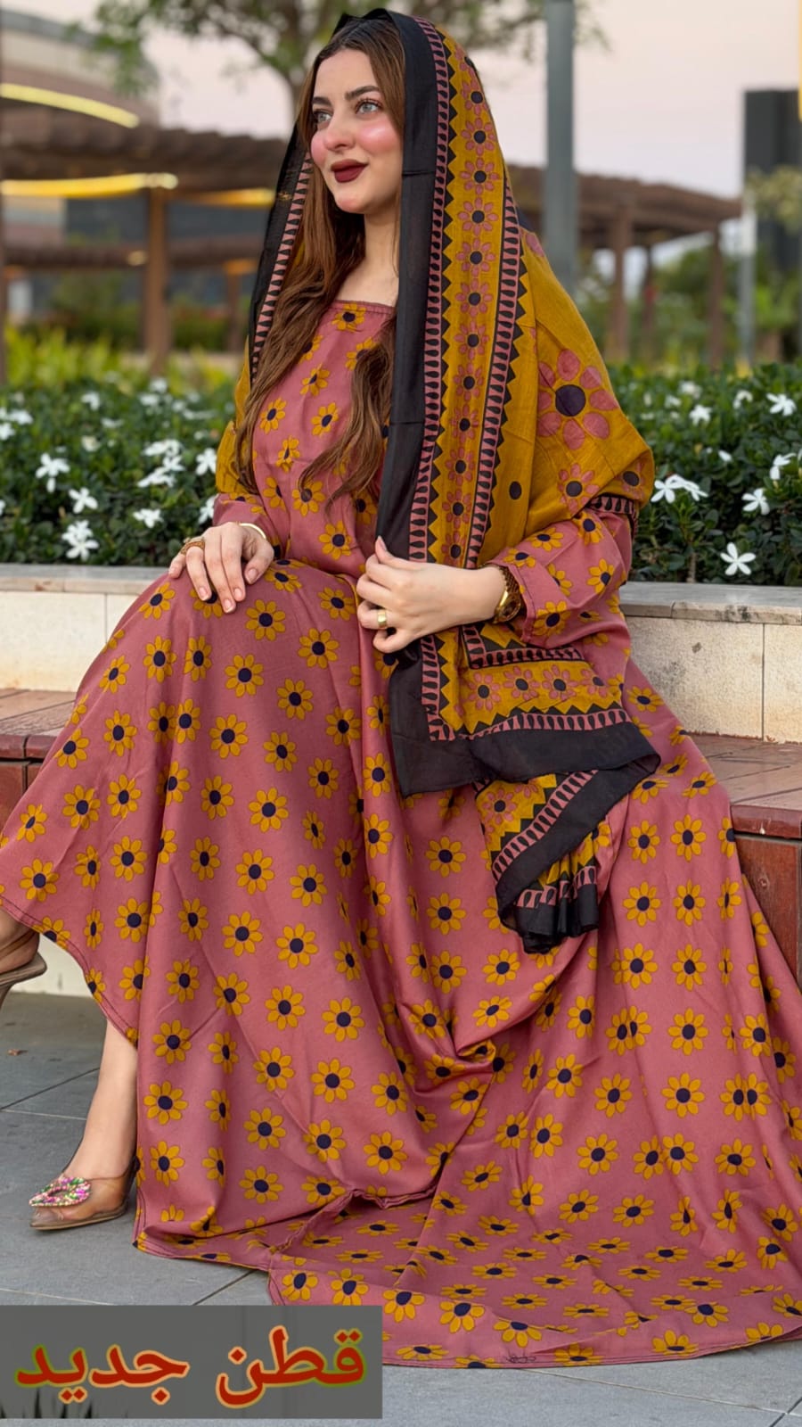 ثوب وردي اللون مصنوع من القطن مع تصميم زهور جميل مطبوع ومزين بشيلة متناسقة مخيطة على الطراز الظفاري