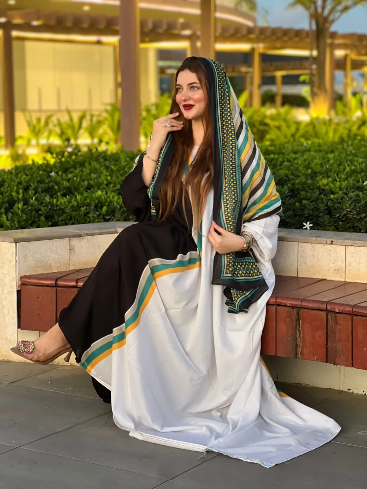 ملابس باللونين الأبيض والأسود مصنوعة من القطن بتصميم جميل مطبوع مع شيلة مطابقة مخيطة على الطراز الظفاري