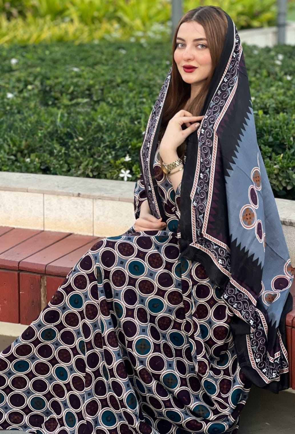 ثوب متعدد الألوان مصنوع من القطن بتصميم دائري جميل مطبوع عليه شيلة متناسقة مخيطة على الطراز الظفار