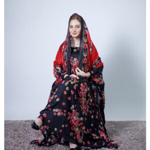 ثوب أسود اللون مصنوع من القطن بتصميم جميل مطبوع عليه شيلة متناسقة مخيطة على الطراز الظفاري