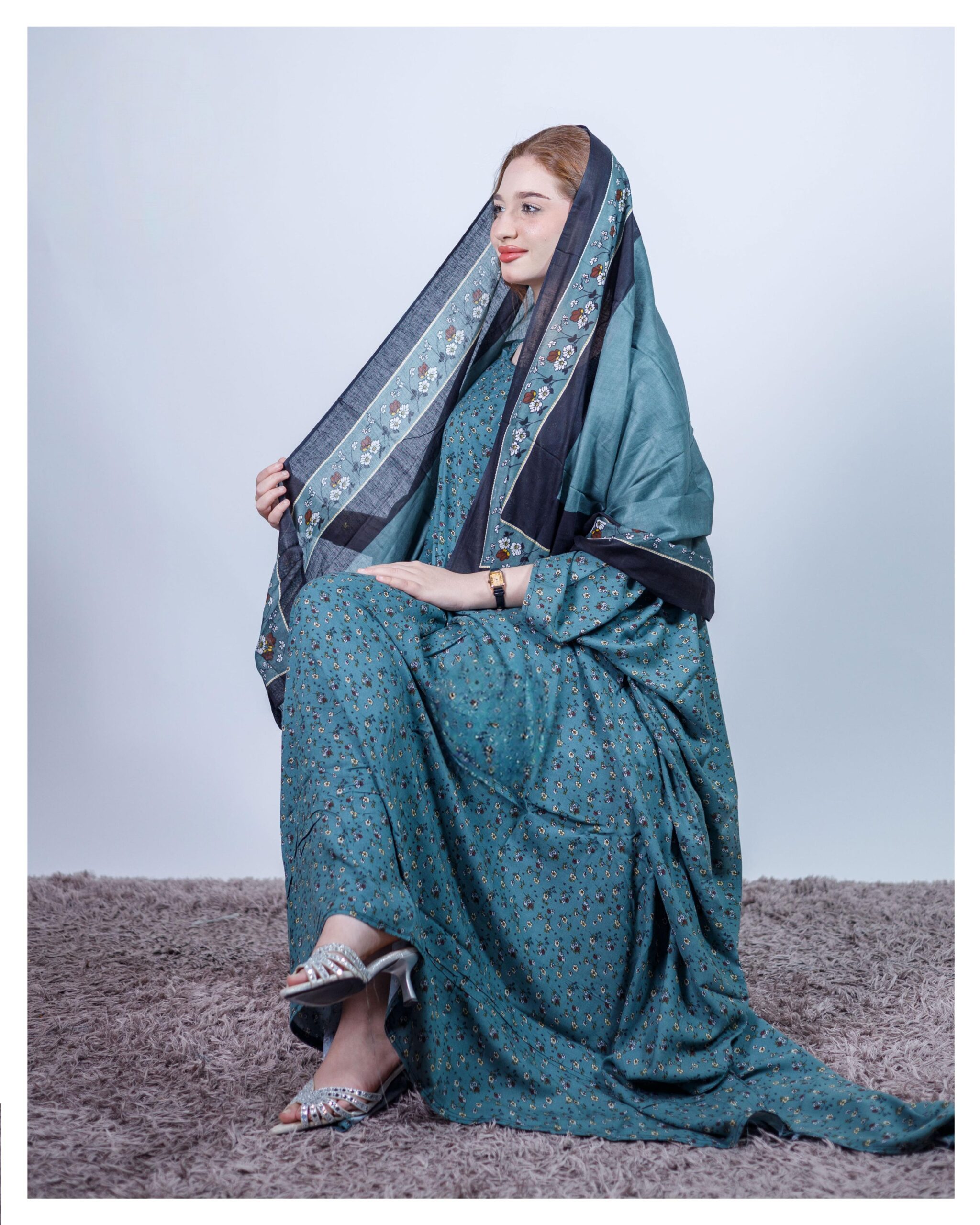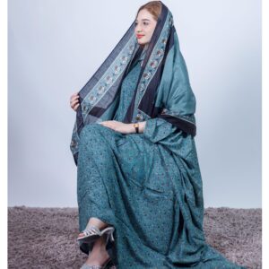 ثوب فيروزي ملون مصنوع من القطن بتصميم زهور جميل مطبوع عليه شيلة متناسقة مخيطة على الطراز الظفاري