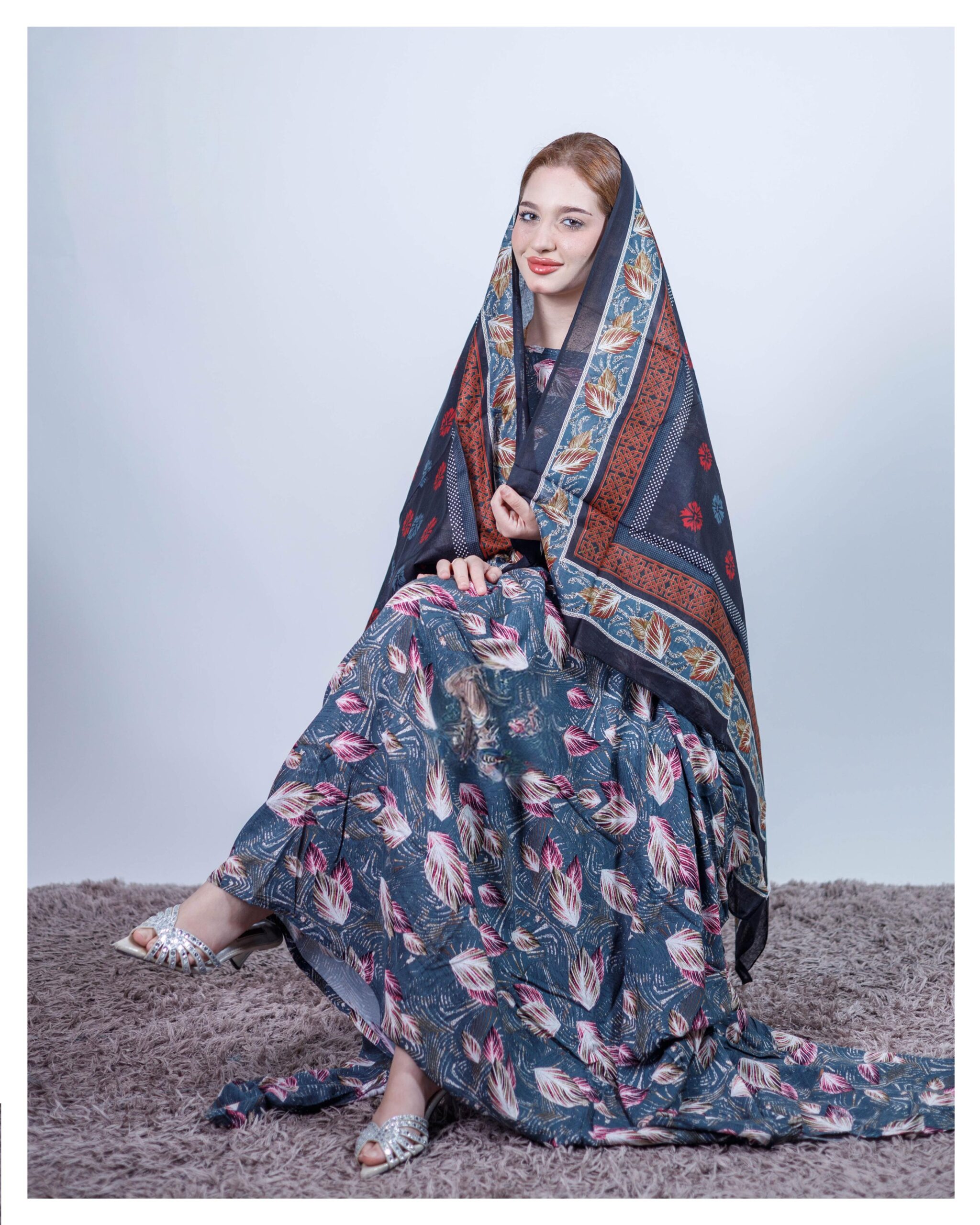 ثوب مصنوع من القطن بتصميم جميل مطبوع عليه شيلة متناسقة مخيطة على الطراز الظفاري