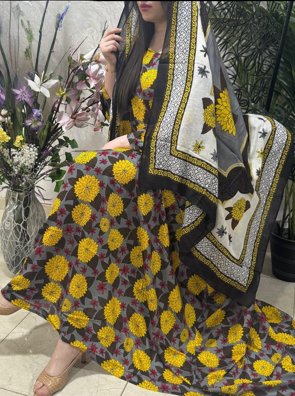 ثوب مصنوع من القطن مع تصميم زهرة جميلة باللون الأصفر مطبوعة مع شيلة متناسقة مخيطة على الطراز الظفاري