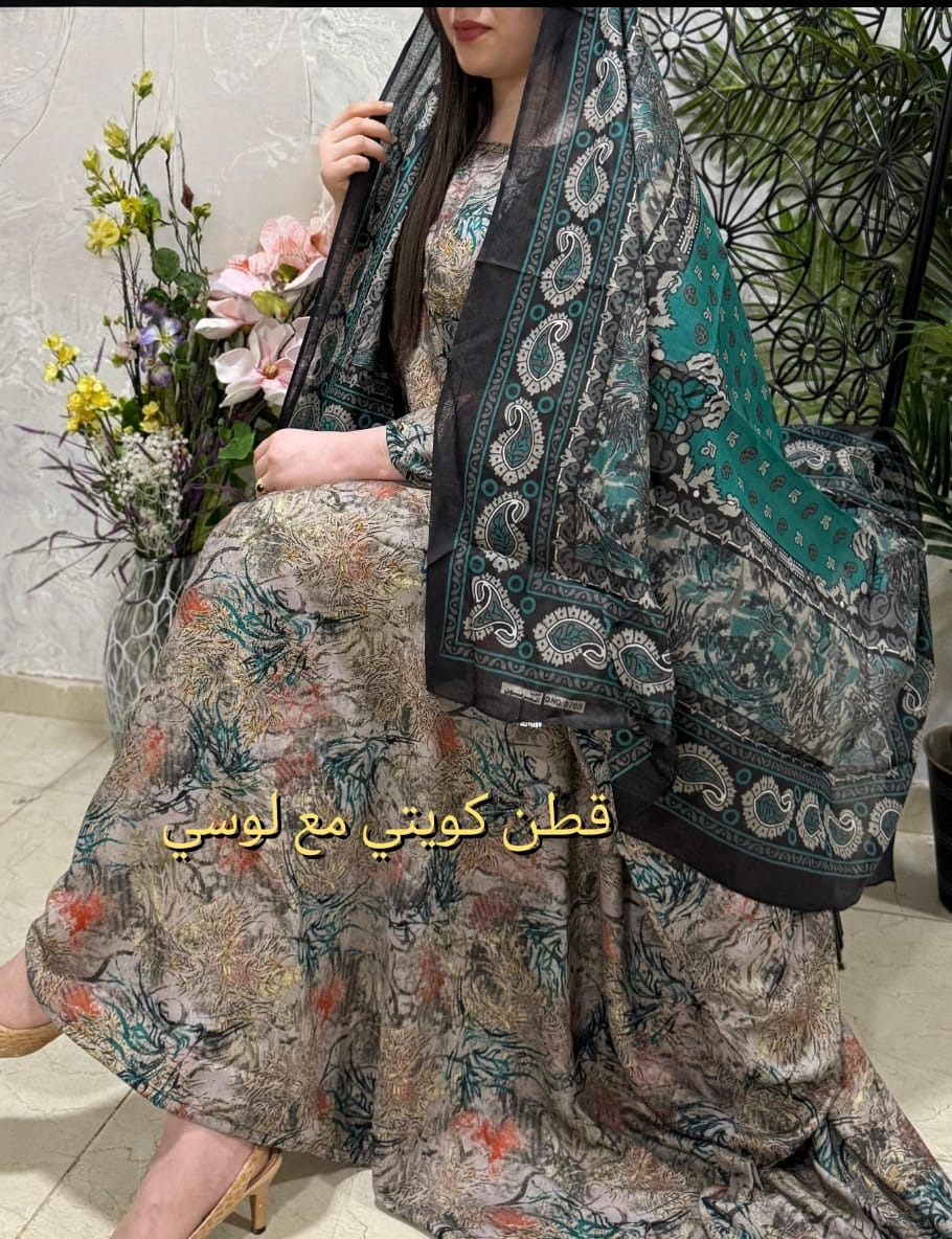 ثوب مصنوع من القطن الكويتي بتصميم جميل مطبوع مع شيلة متناسقة مخيطة على الطراز الظفاري