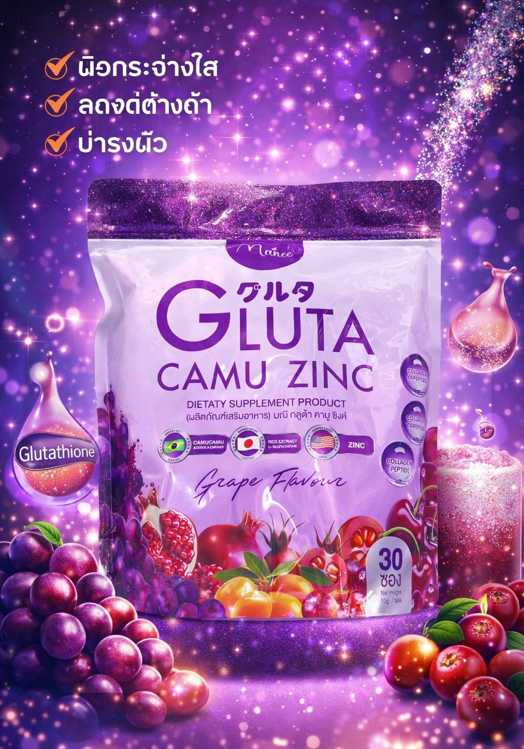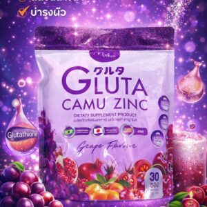 Manee Gluta Camu Zinc Supplement | Grape Flavor Antioxidant & Skin Support | 30 Sachets