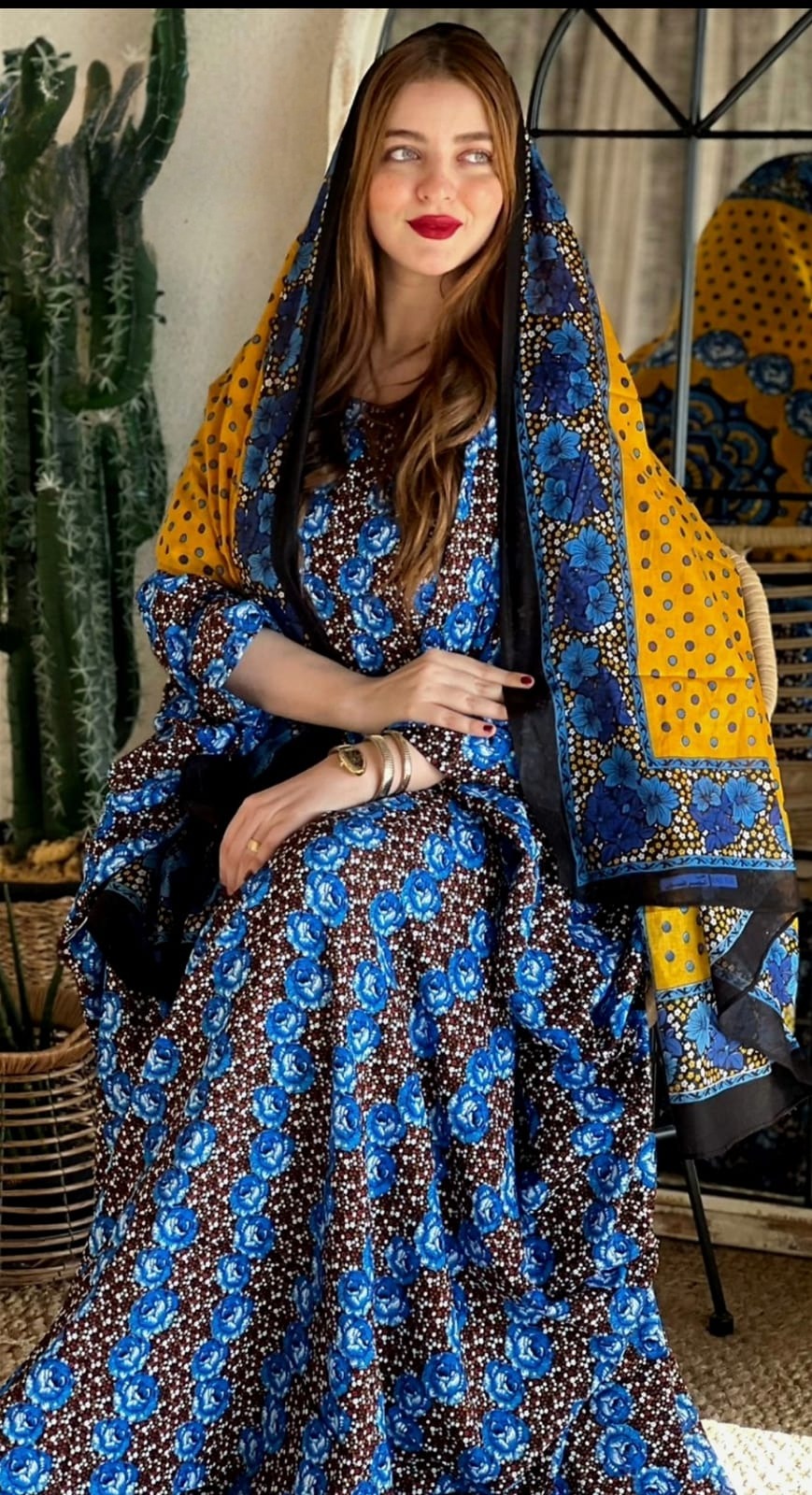 ثوب متعدد الألوان مصنوع من القطن مع تصميم زهرة زرقاء جميلة مطبوعة مع شيلة متناسقة مخيطة على الطراز الظفاري