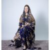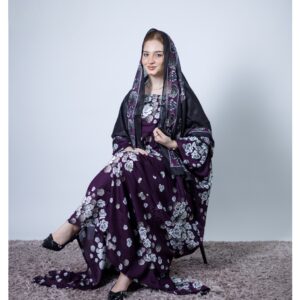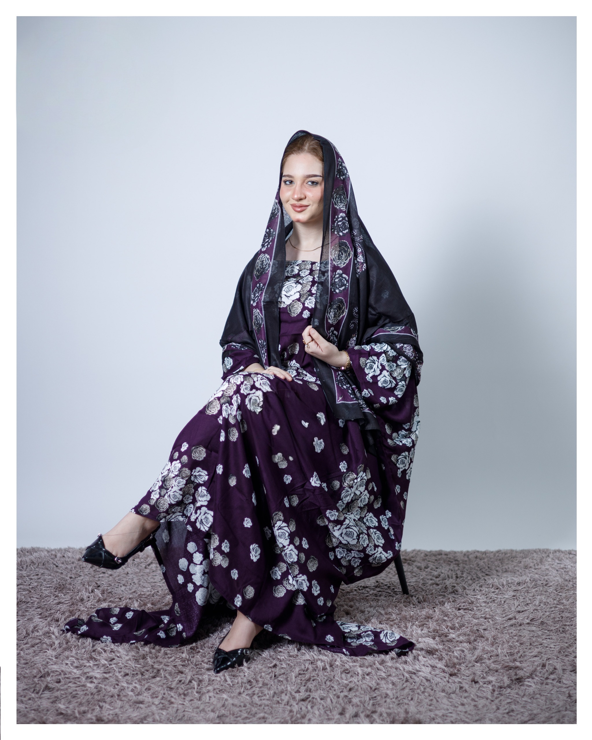ثوب باللون الأرجواني مصنوع من القطن بتصميم جميل مطبوع عليه شيلة متناسقة مخيطة على الطراز الظفاري