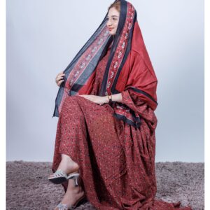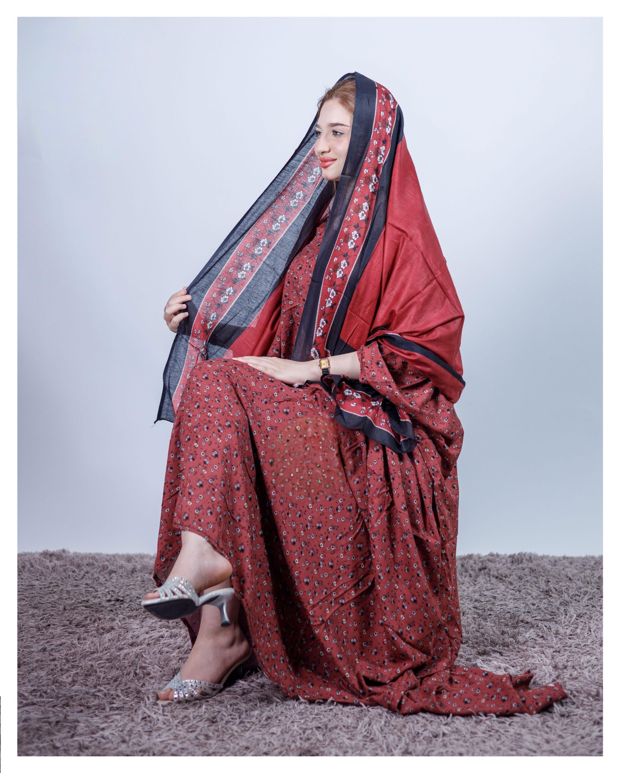 ثوب أحمر اللون مصنوع من القطن بتصميم زهور جميلة مطبوع عليه شيلة متناسقة مخيطة على الطراز الظفاري